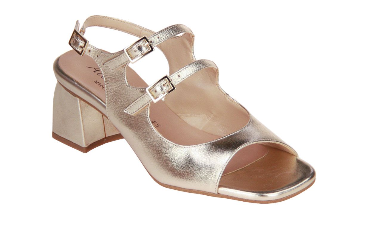 Deze goud lederen damessandaal is van het merk Altramarea.