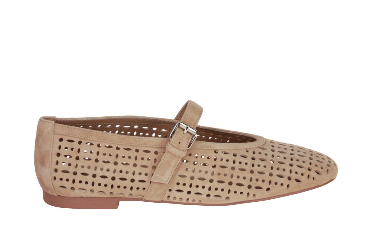 Deze beige suède damesschoen is van het merk Bibi Lou.