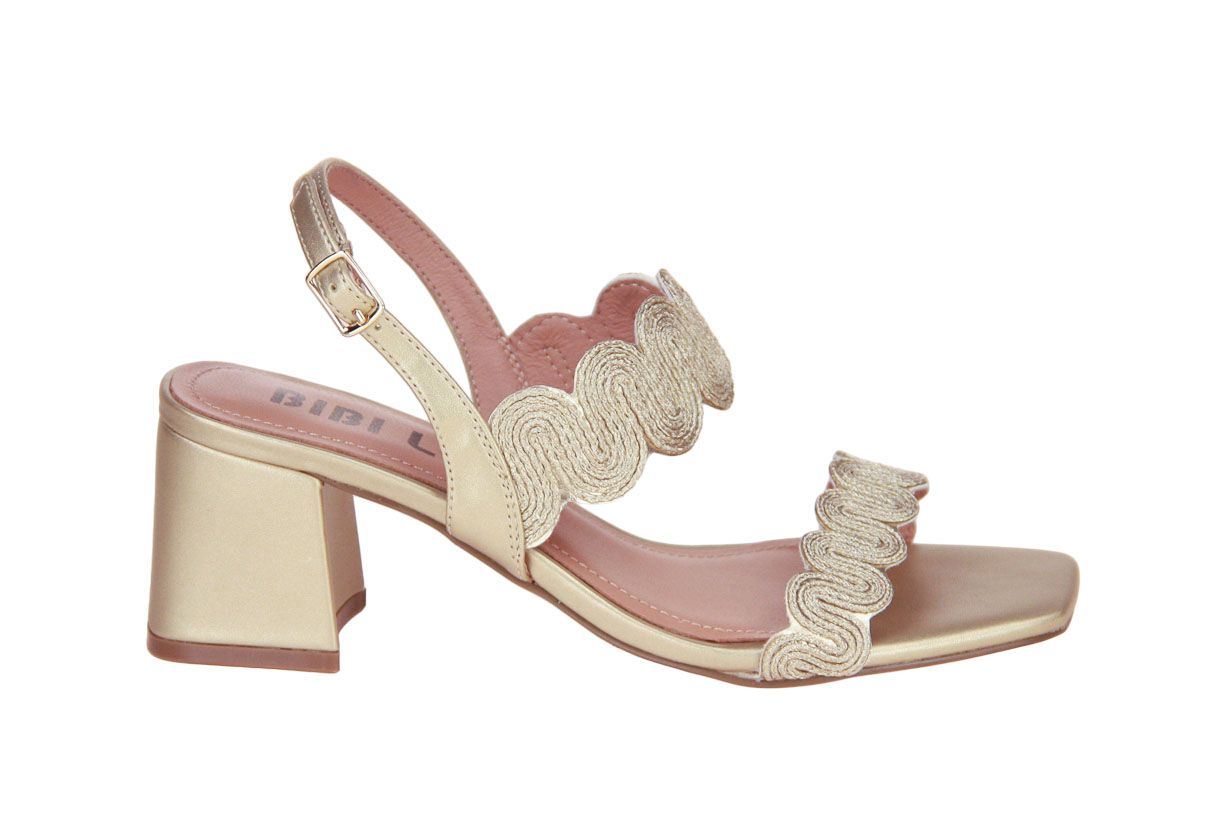 Deze goud lederen damessandaal is van het merk Bibi Lou.