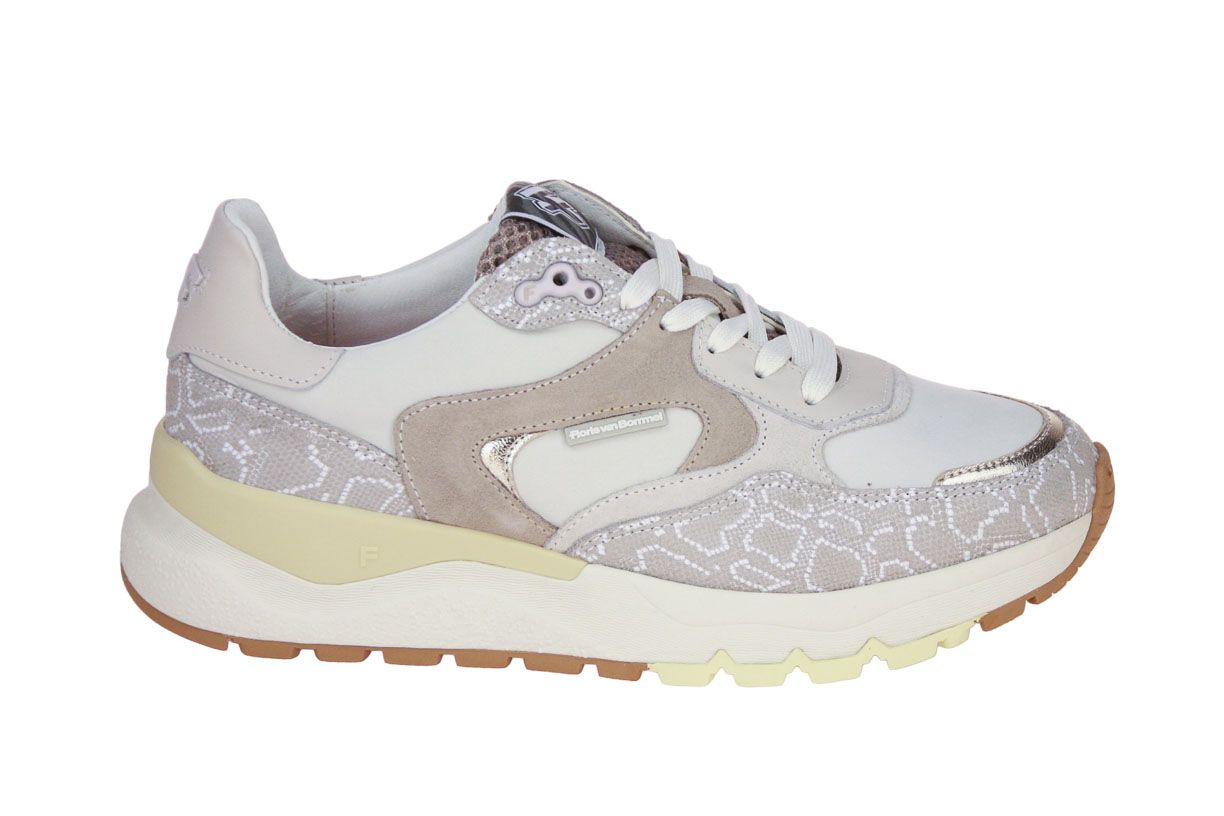 Deze wit lederen damesschoen met taupe accenten is van het merk Floris van Bommel. De binnenzool is uitneembaar, ideaal voor steunzolen.