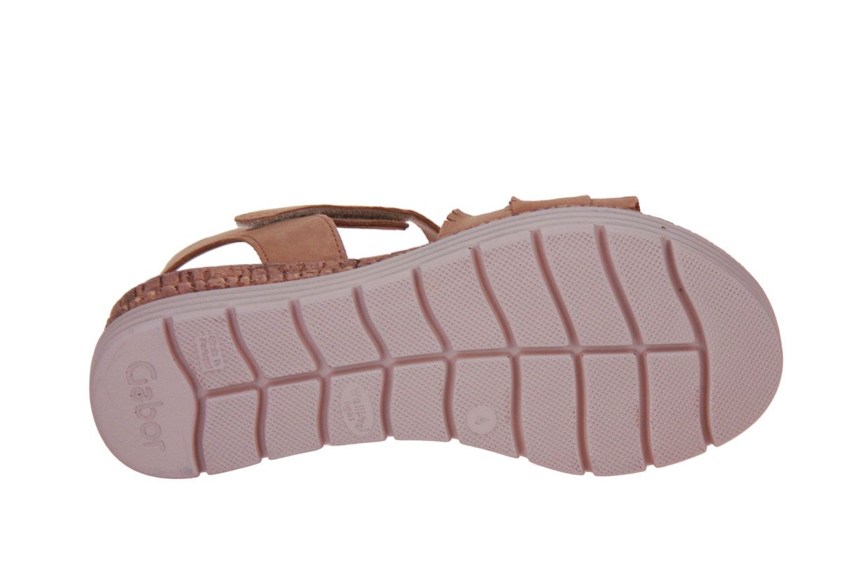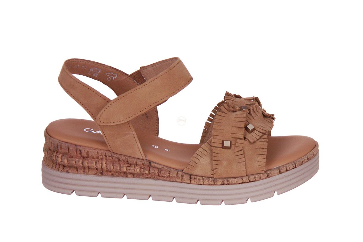 Deze cognac nubuck damessandaal is van het merk Gabor.
