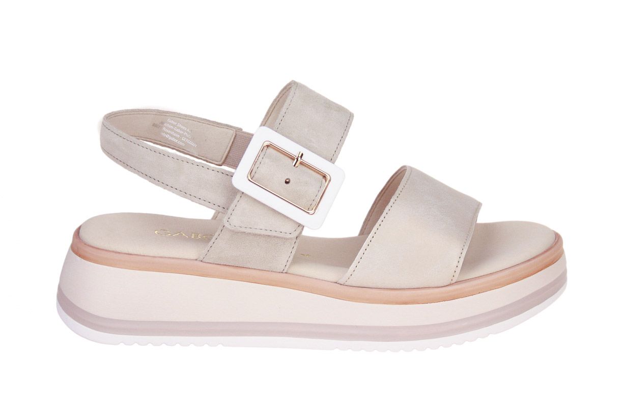 Deze beige suède damessandaal is van het merk Gabor.