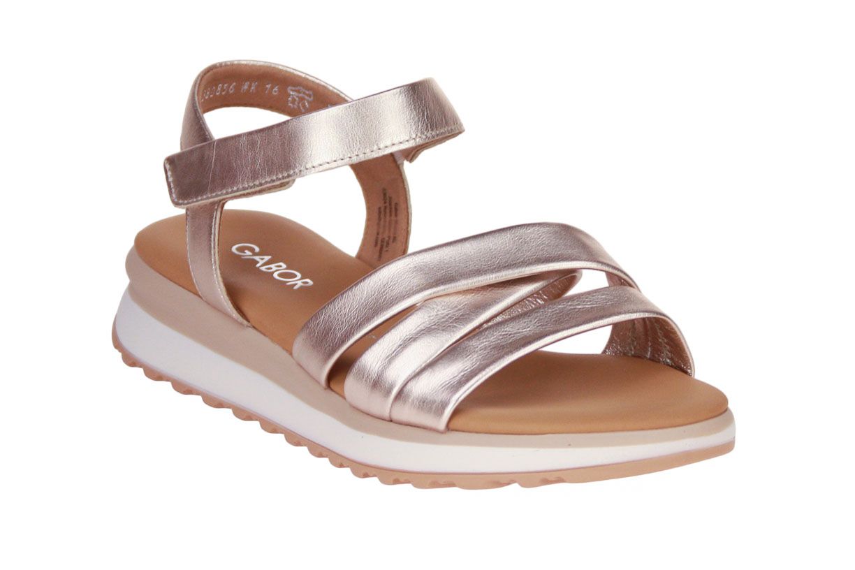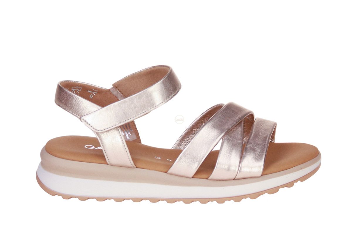 Deze brons lederen damessandaal is van het merk Gabor.
