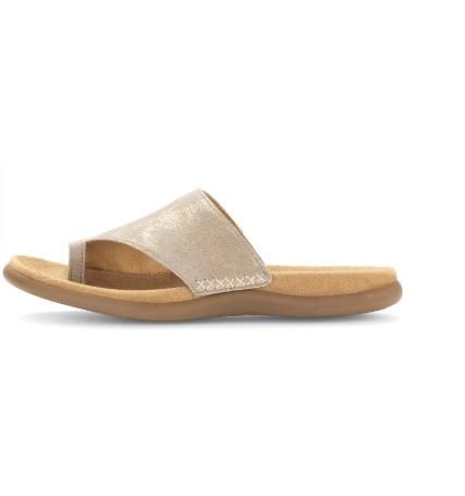 Deze goud metallic lederen damesslipper is van het merk Gabor.