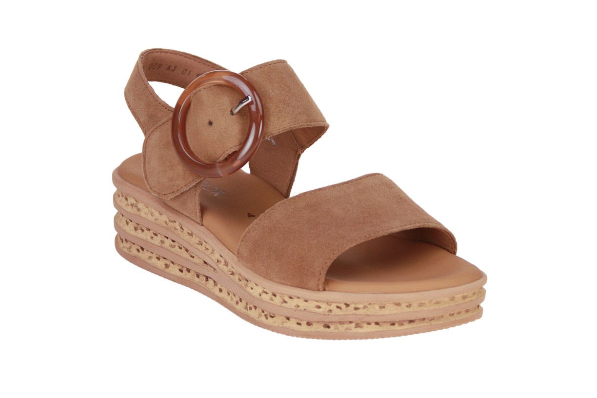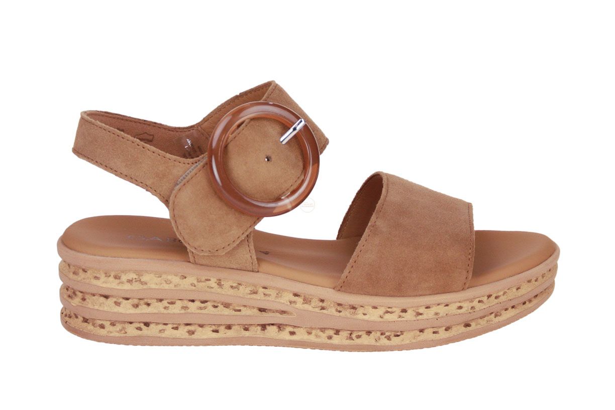 Deze cognac suède damessandaal is van het merk Gabor.