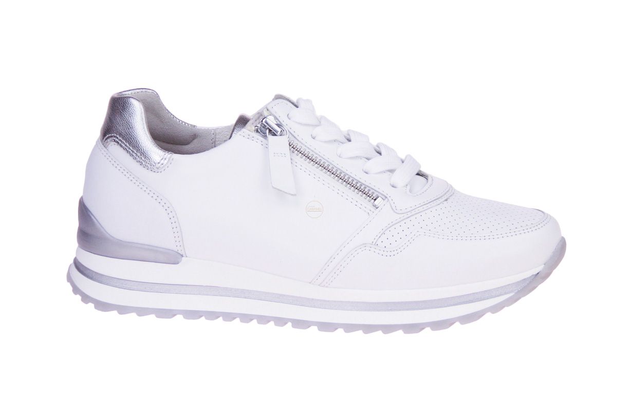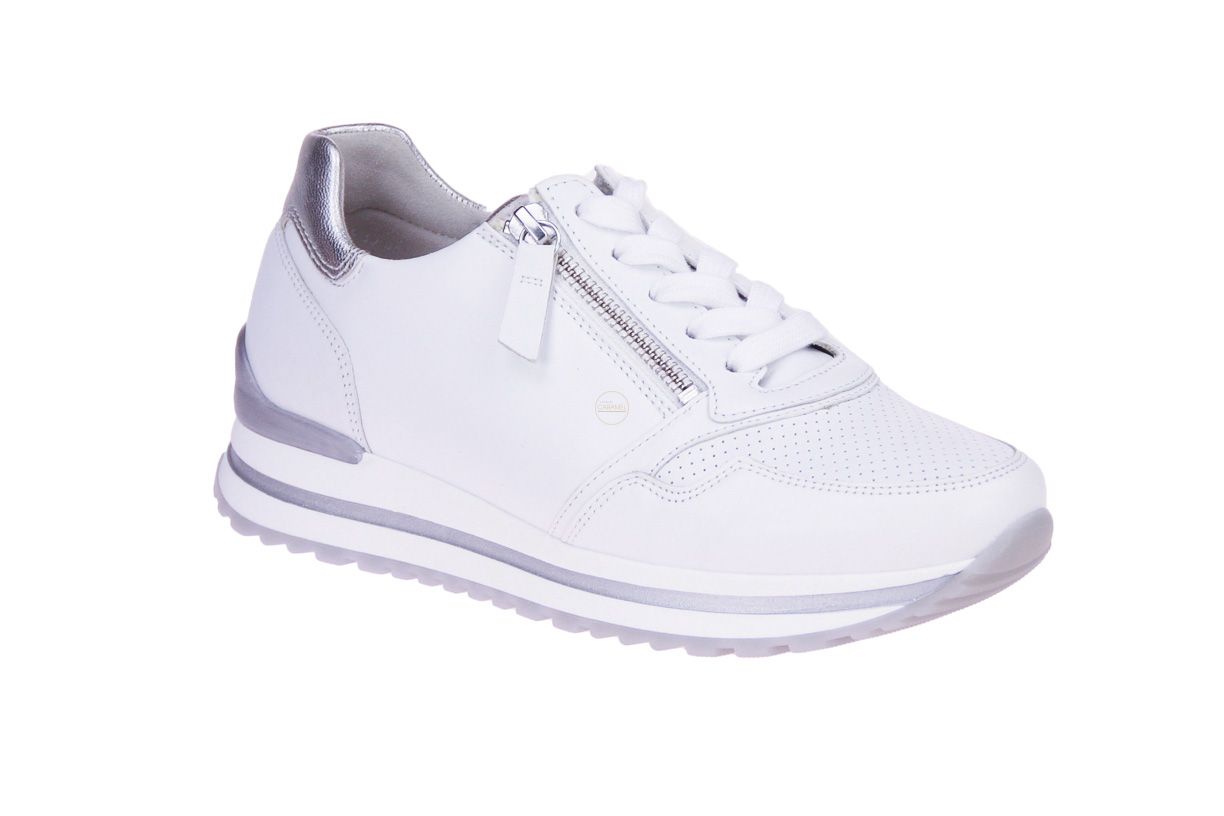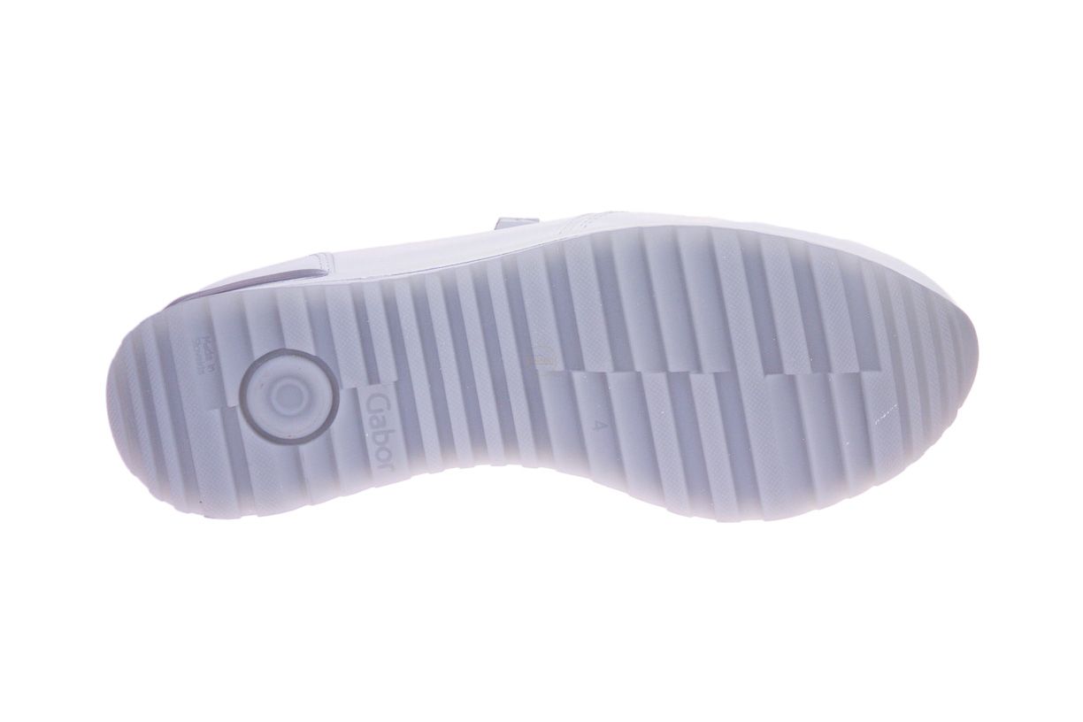 Wit lederen damesschoen met zilveren accenten van het merk Gabor. De binnenzool is uitneembaar, ideaal voor steunzolen.