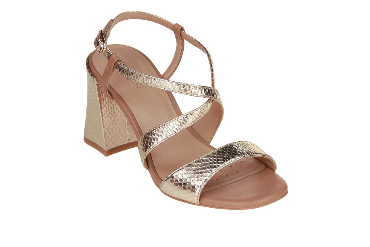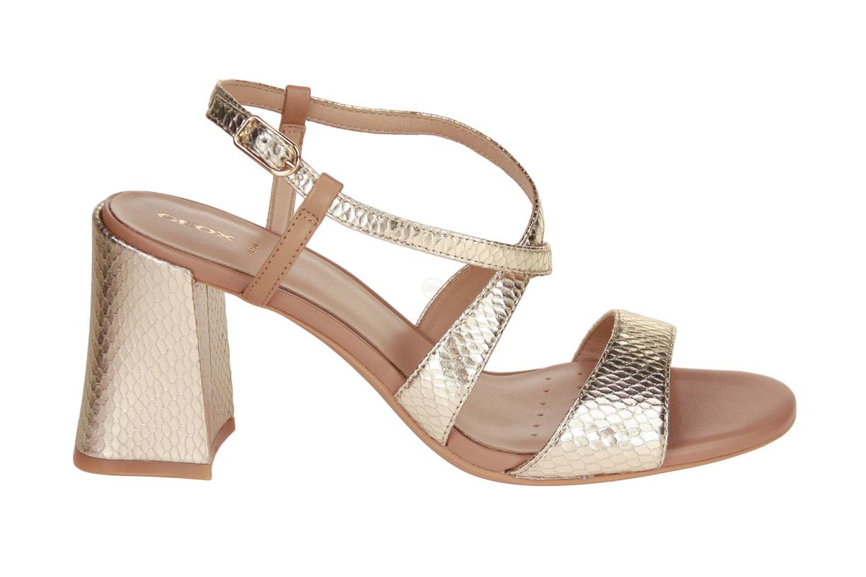 Deze goud lederen damessandaal is van het merk Geox.