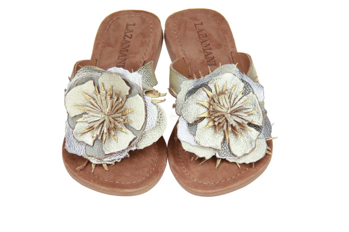 Deze goud lederen damesslipper is van het merk Lazamani.