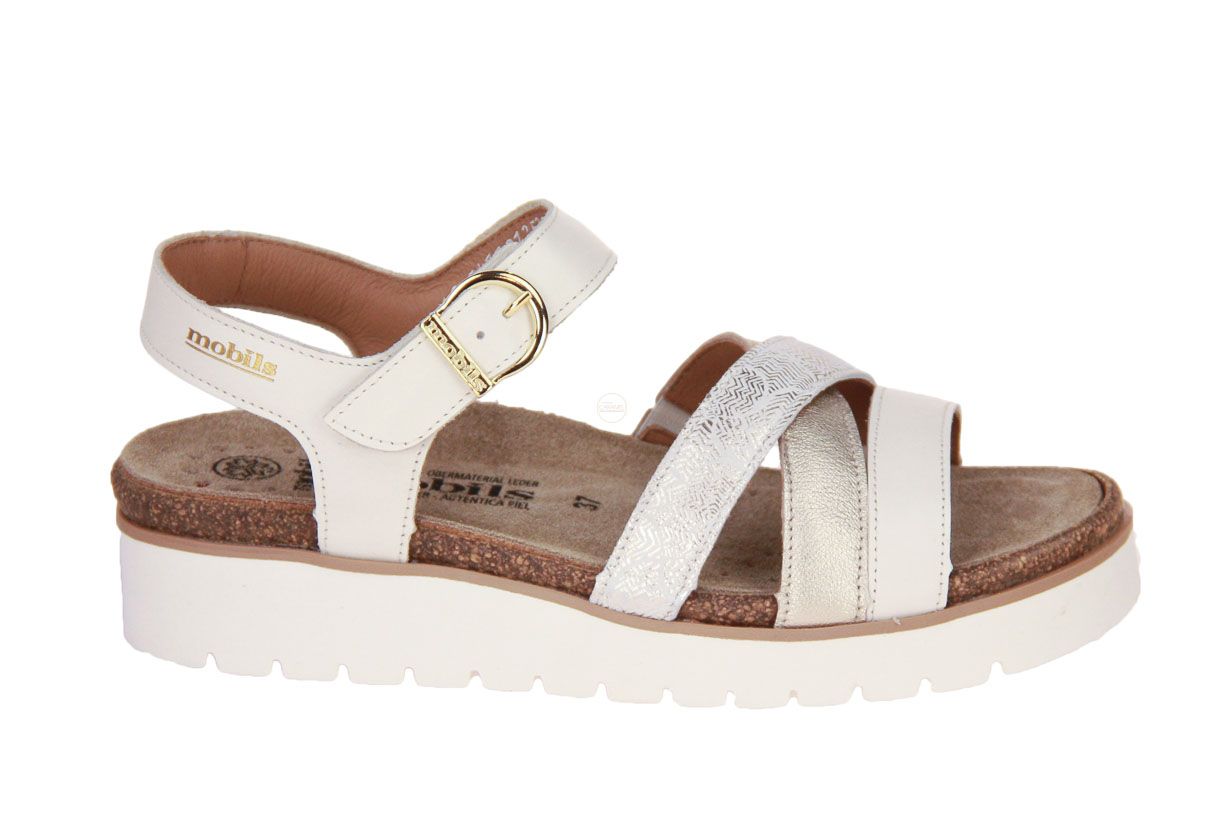 Deze offwhite lederen damessandaal is van het merk Mephisto Mobils Ergonomic. De binnenzool is uitneembaar, ideaal voor steunzolen.