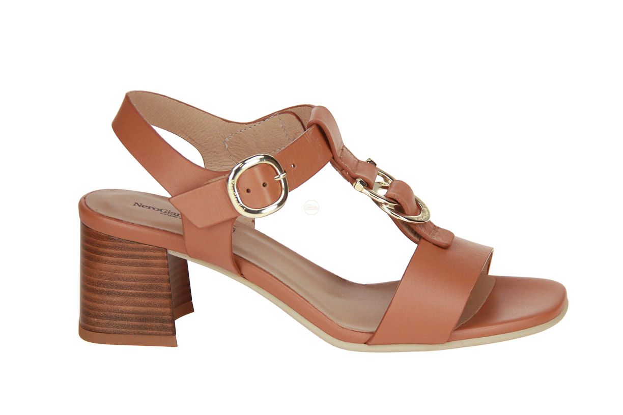 Deze cognac lederen damessandaal is van het merk Nero Giardini.
