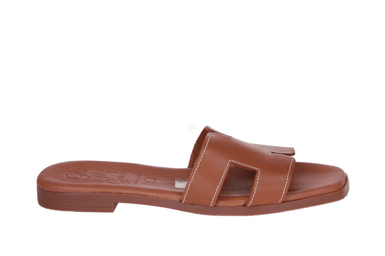 Deze camel lederen damesslipper is van het merk Oh My Sandals.