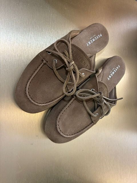 Deze taupe suède damesschoen is van het merk Pavement.