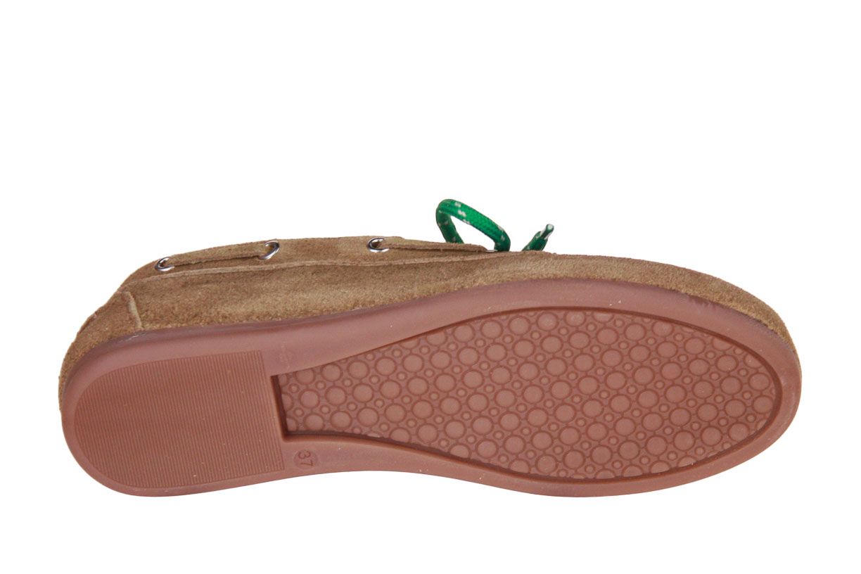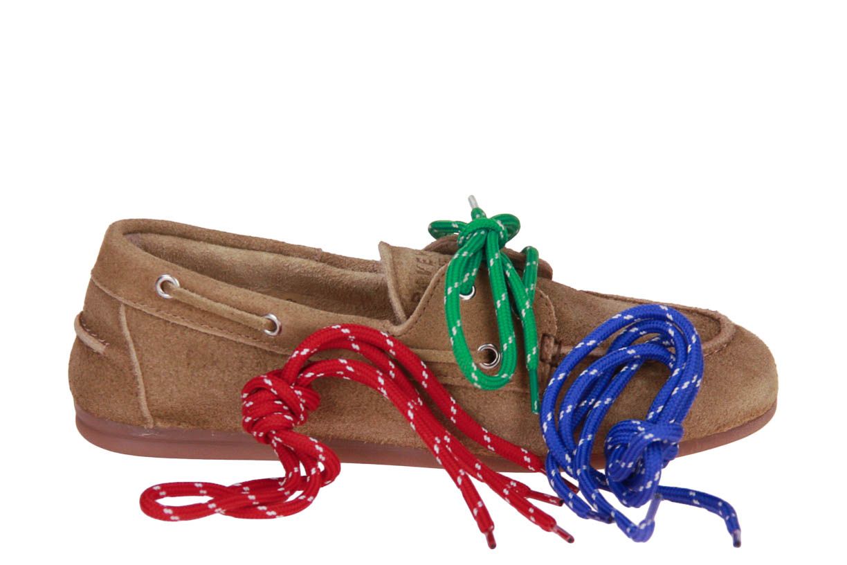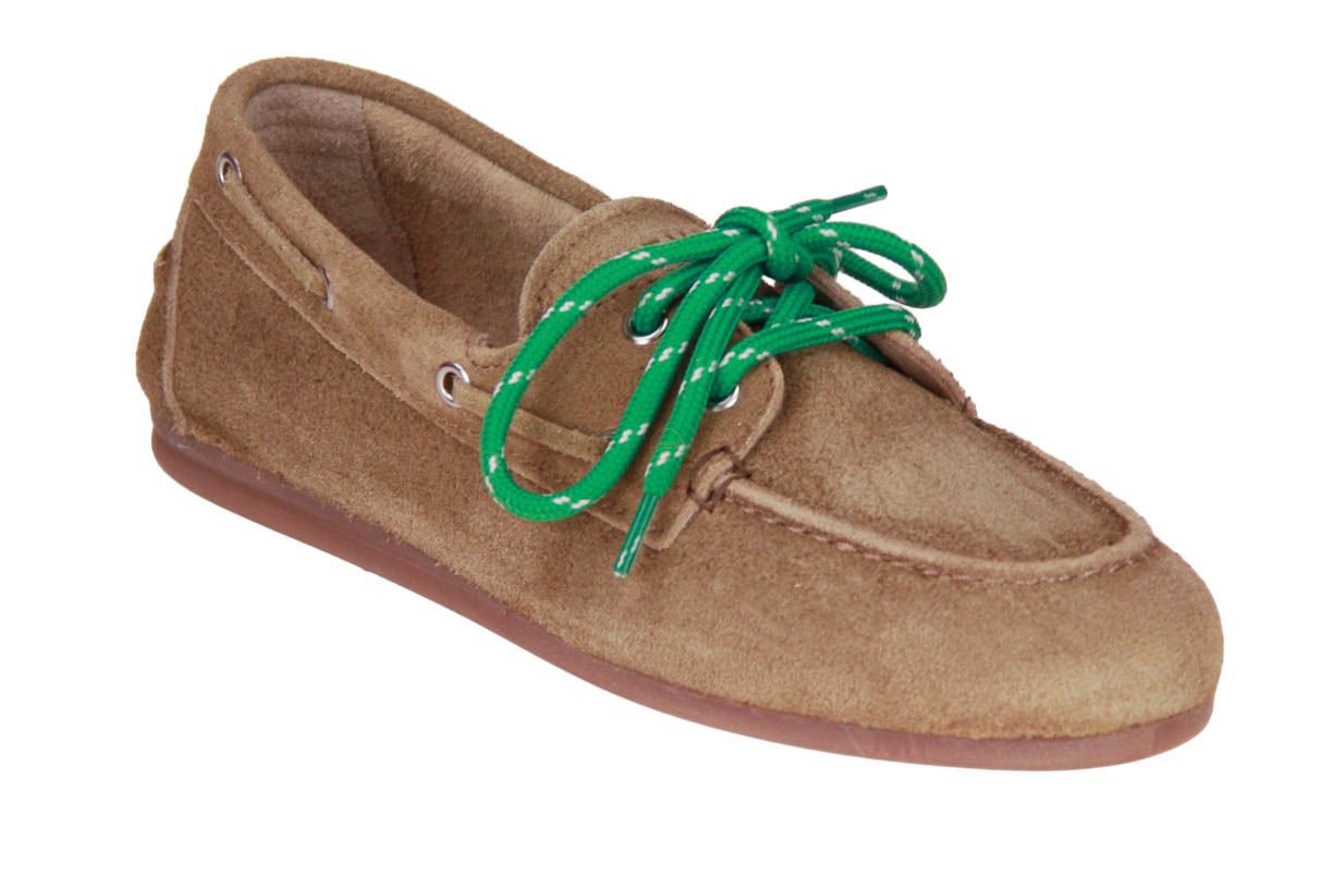 Deze taupe suède damesschoen is van het merk Pavement.