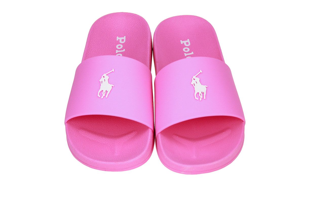 Deze roze rubberen slipper is van het merk Ralph Lauren.