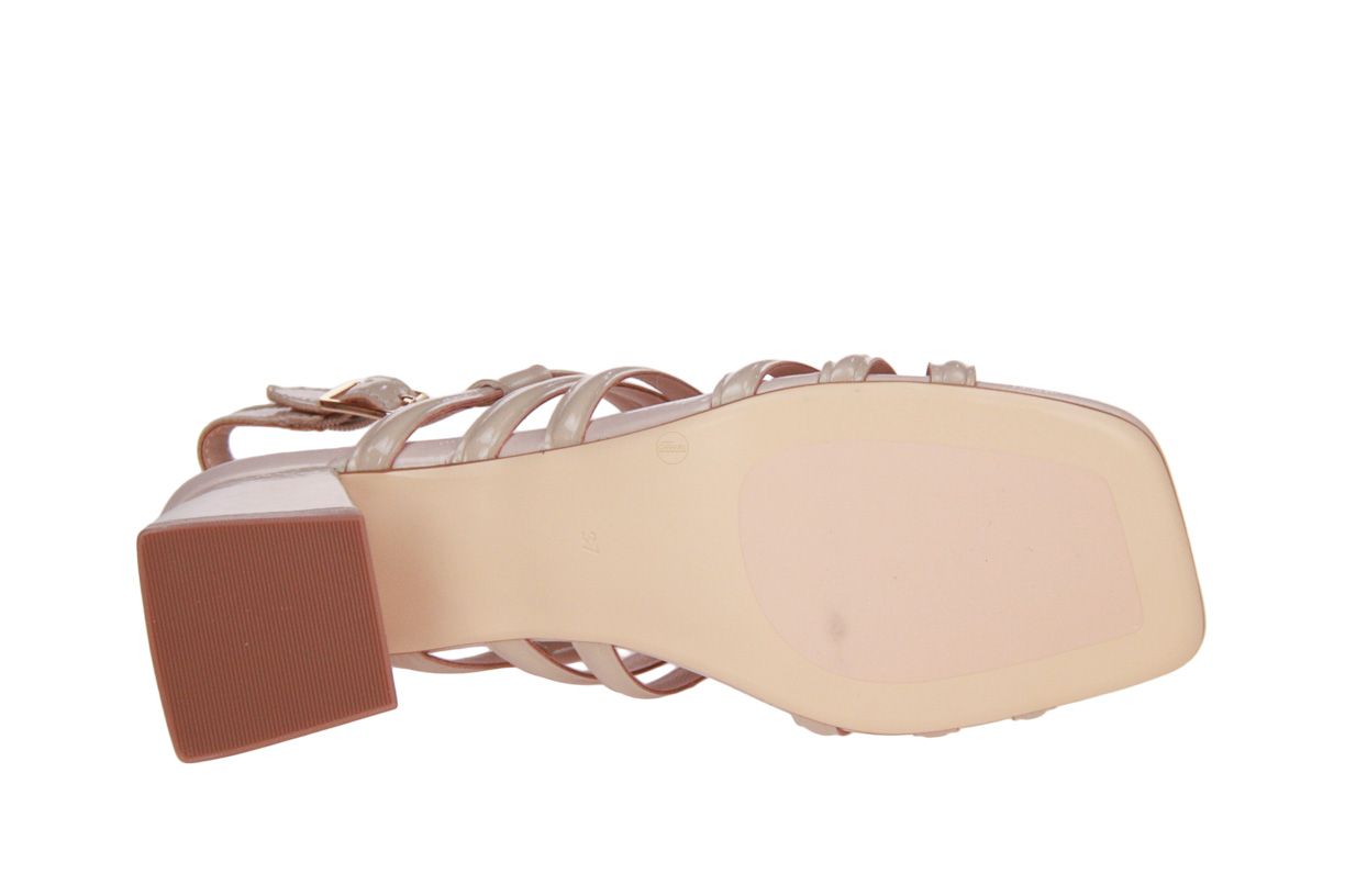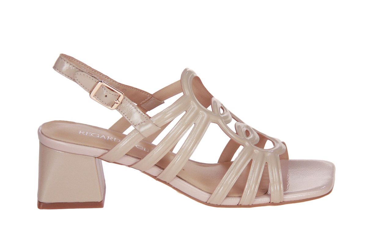 Deze beige laklederen damessandaal is van het merk Regarde Le Ciel.
