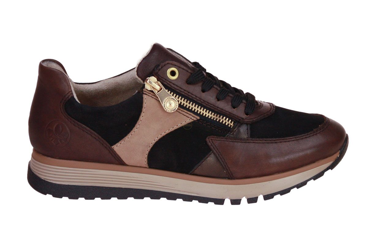 Deze bruin lederen damesschoen is van het merk Rieker. De binnenzool is uitneembaar, ideaal voor steunzolen.