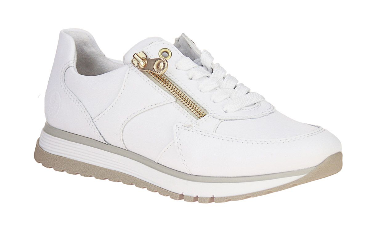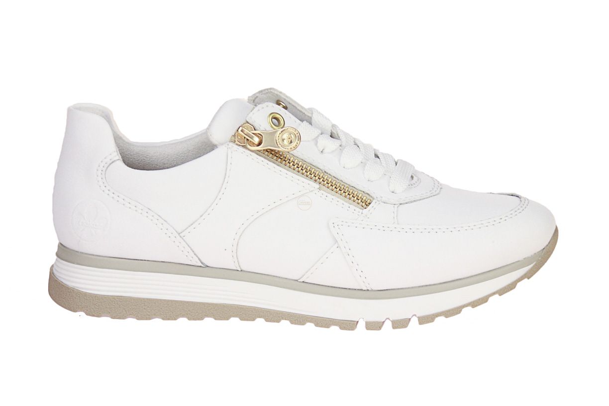 Wit lederen damesschoen van het merk Rieker. De binnenzool is uitneembaar, ideaal voor steunzolen.