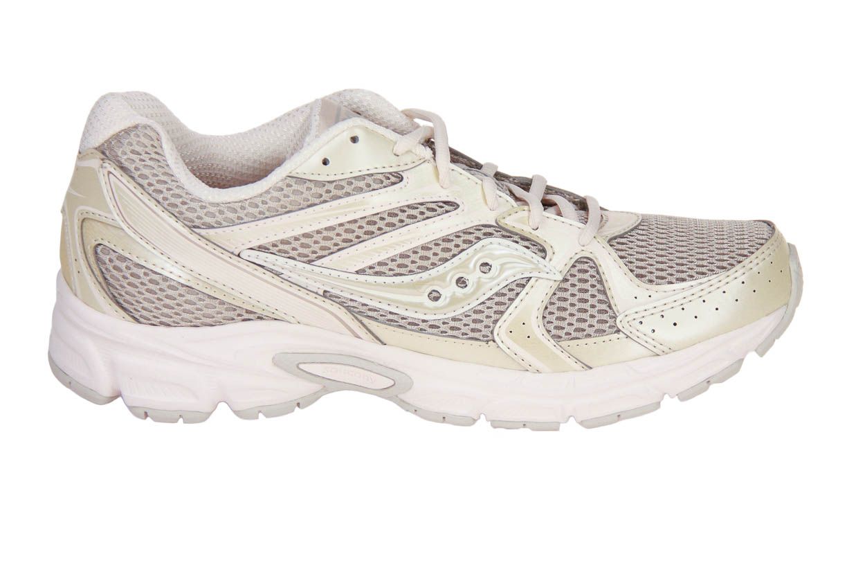 Deze beige textielen sneaker is van het merk Saucony. De binnenzool is uitneembaar, ideaal voor steunzolen.
