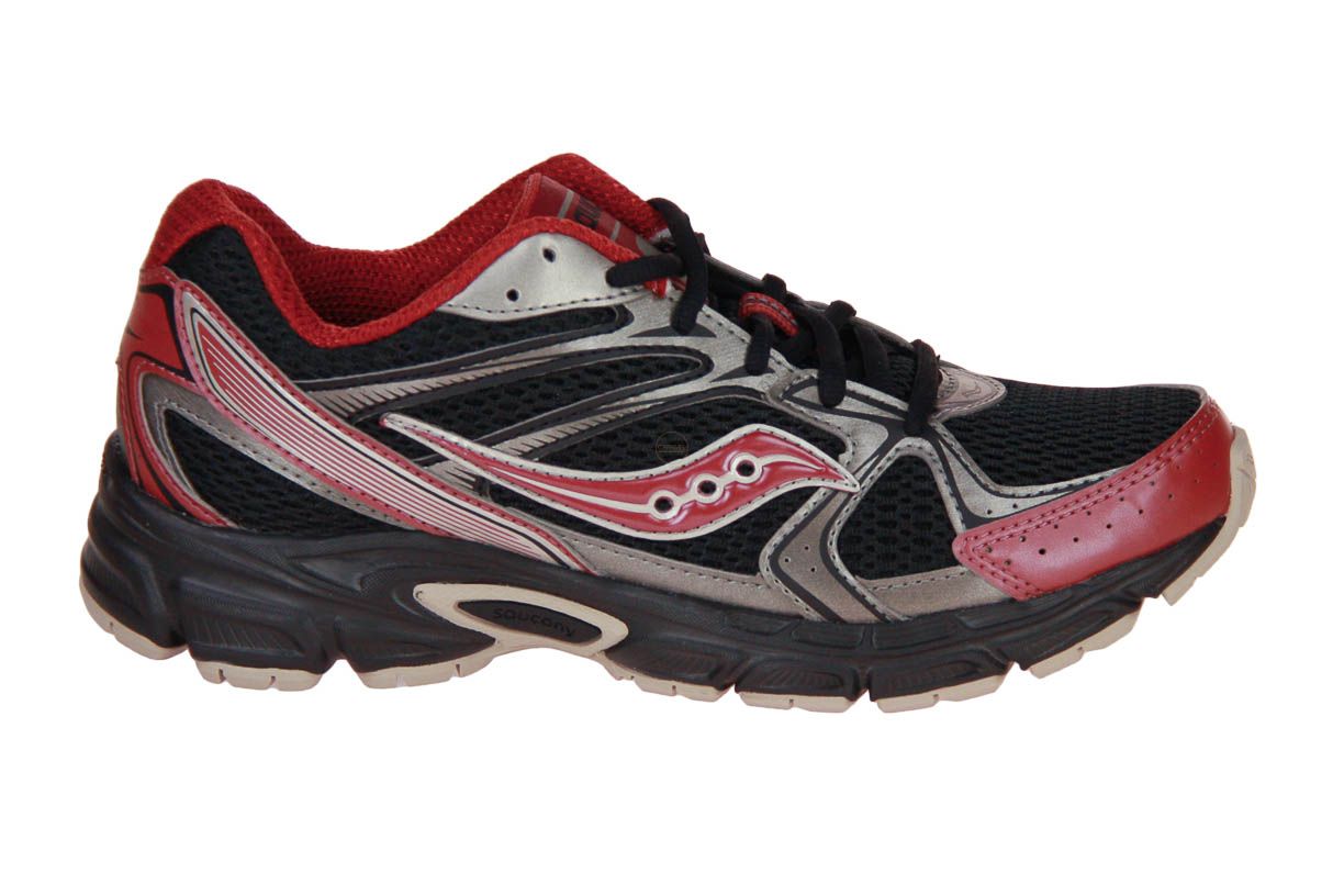 Deze zwart textielen sneaker met rode accenten is van het merk Saucony. De binnenzool is uitneembaar, ideaal voor steunzolen.