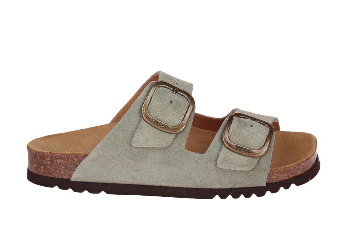 Deze groen suède damesslipper is van het merk Scholl.