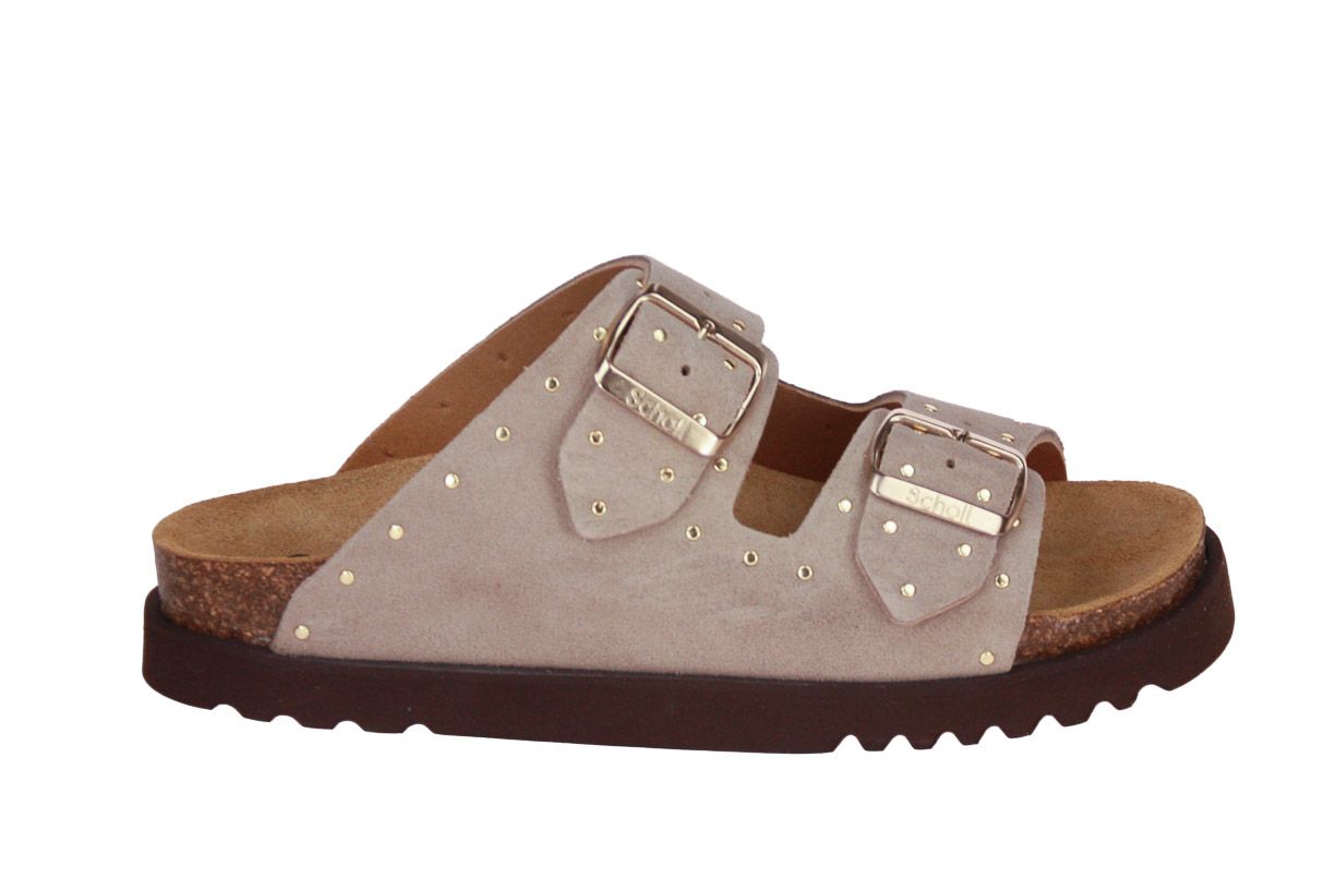 Deze beige suède damesslipper met studs is van het merk Scholl.