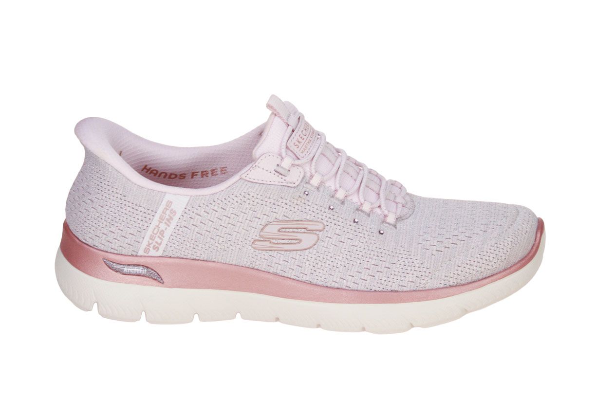 Deze taupe textielen damesschoen is van het merk Skechers.