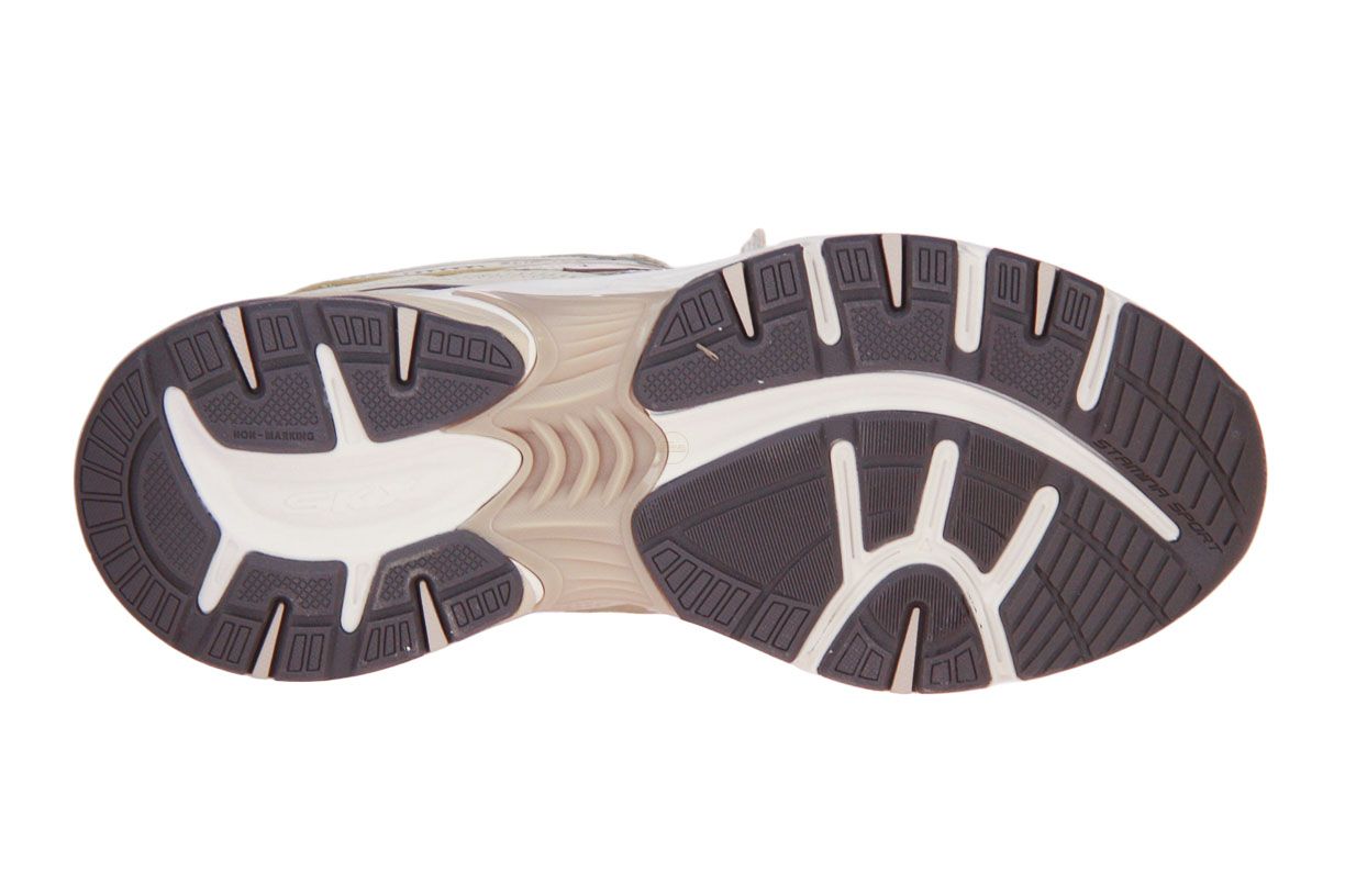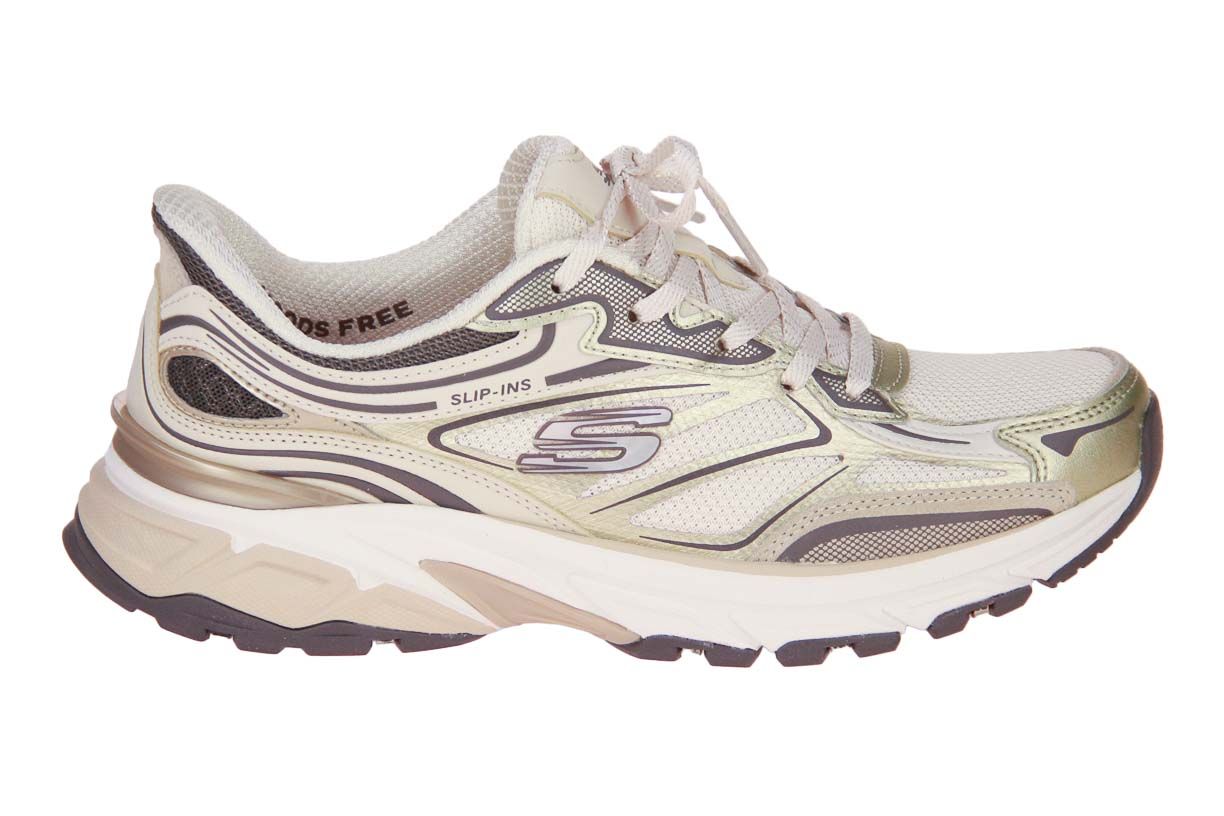 Deze beige textielen damesschoen is van het merk Skechers.