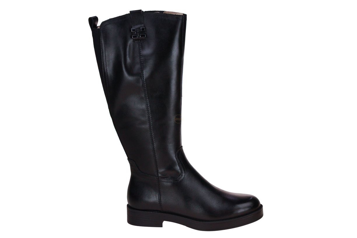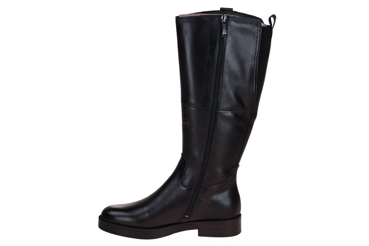 Deze zwart lederen lange dameslaars is van het merk Tamaris.