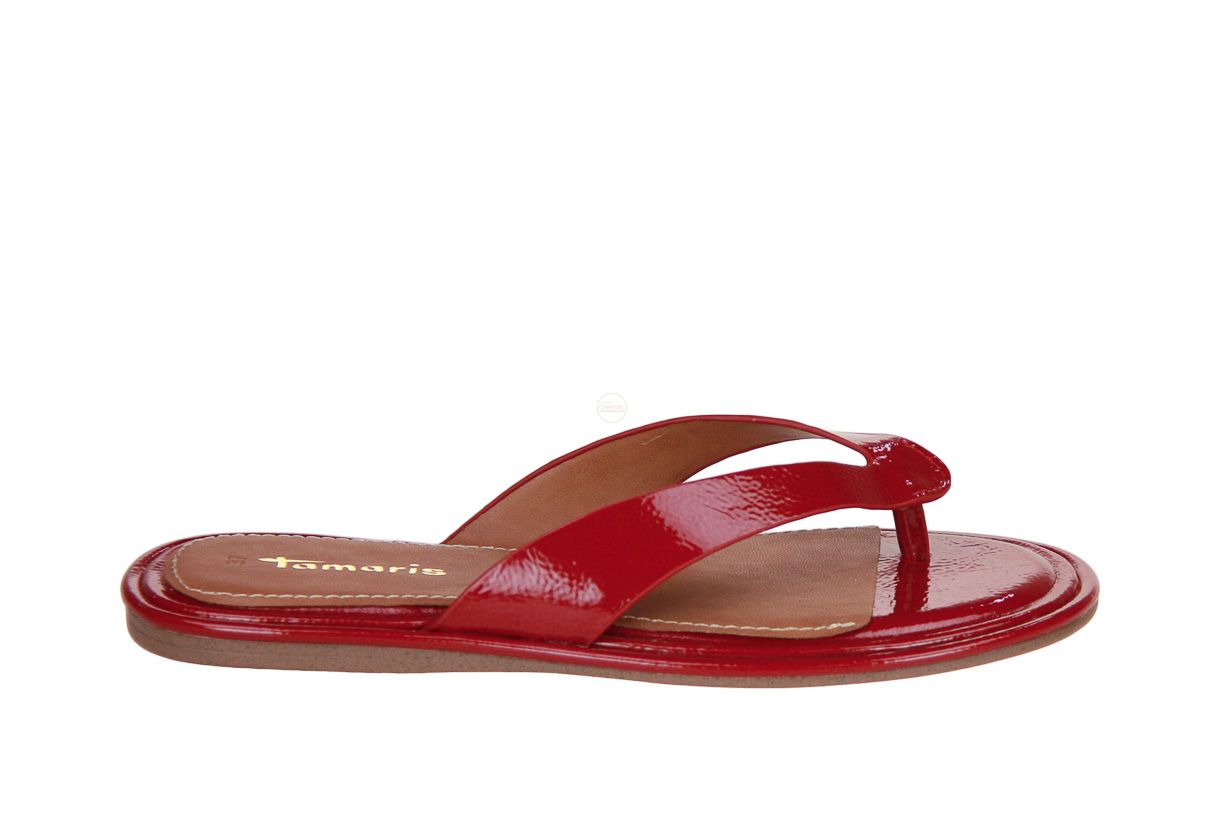 Deze rood laklederen damesslipper is van het merk Tamaris.
