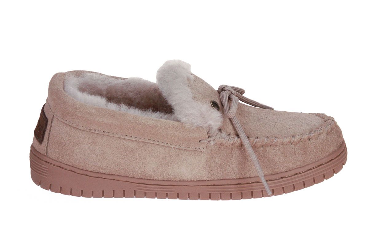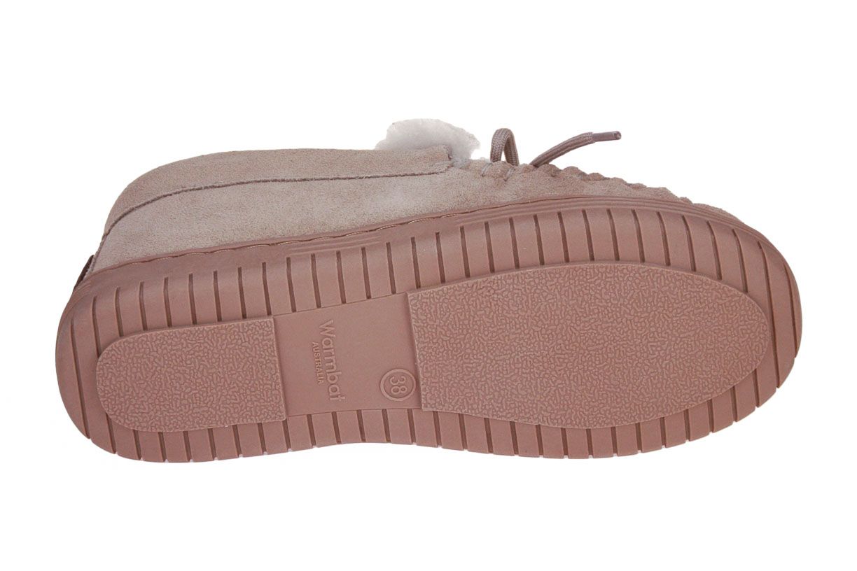 Deze taupe suède damespantoffel is van het merk Warmbat.