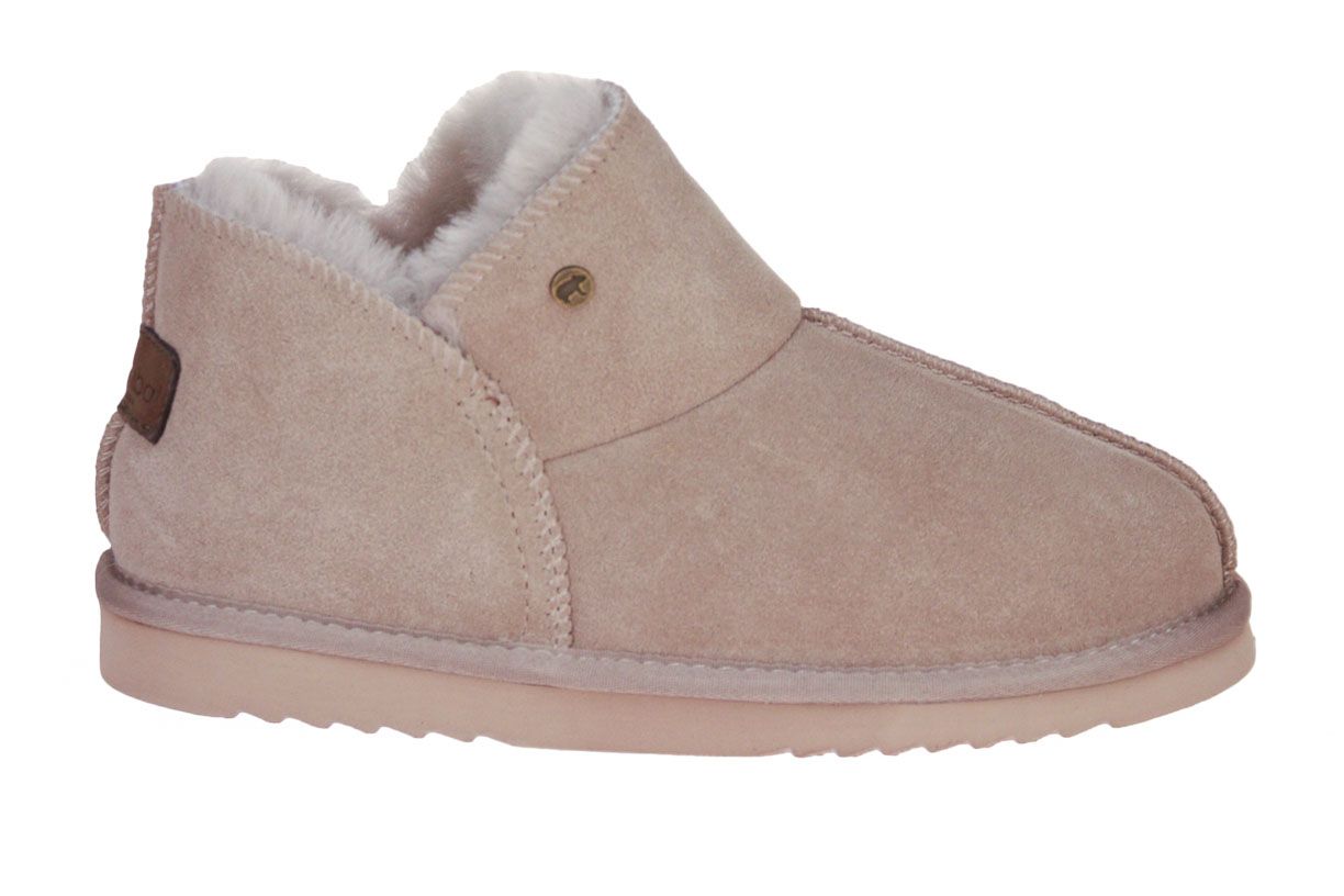 Deze taupe suède damespantoffel is van het merk Warmbat.