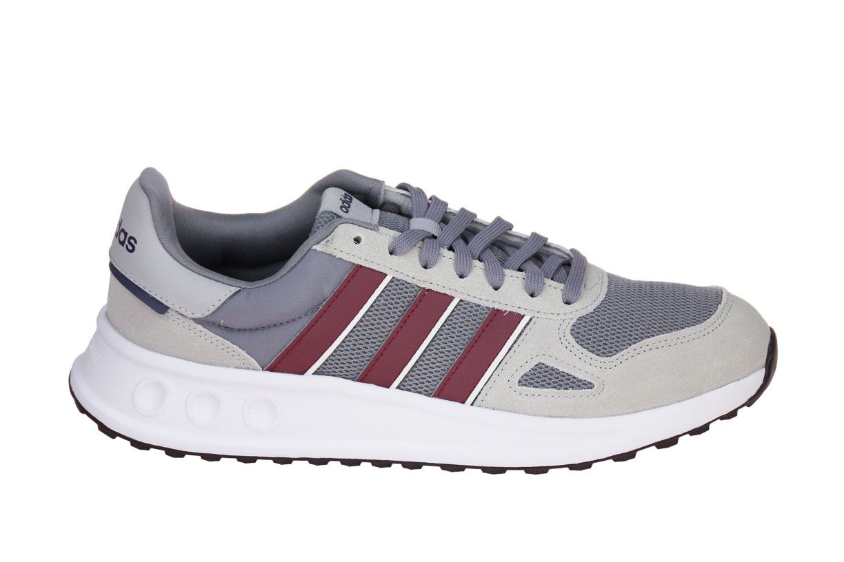 Deze grijs suède sneaker met bordo accenten is van het merk Adidas.