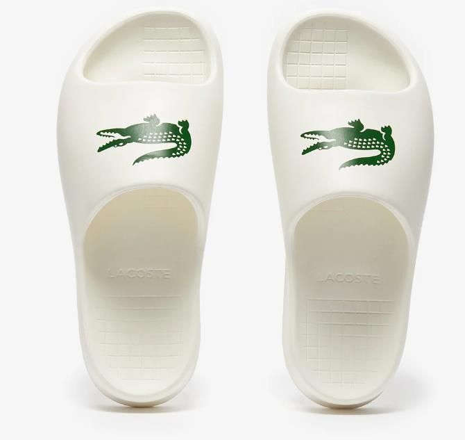 Deze offwhite rubberen herenslipper is van het merk Lacoste.