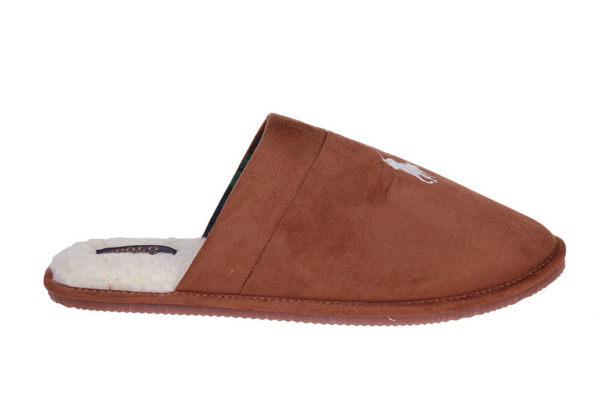 Deze camel suède herenpantoffel is van het merk Ralph Lauren Polo.