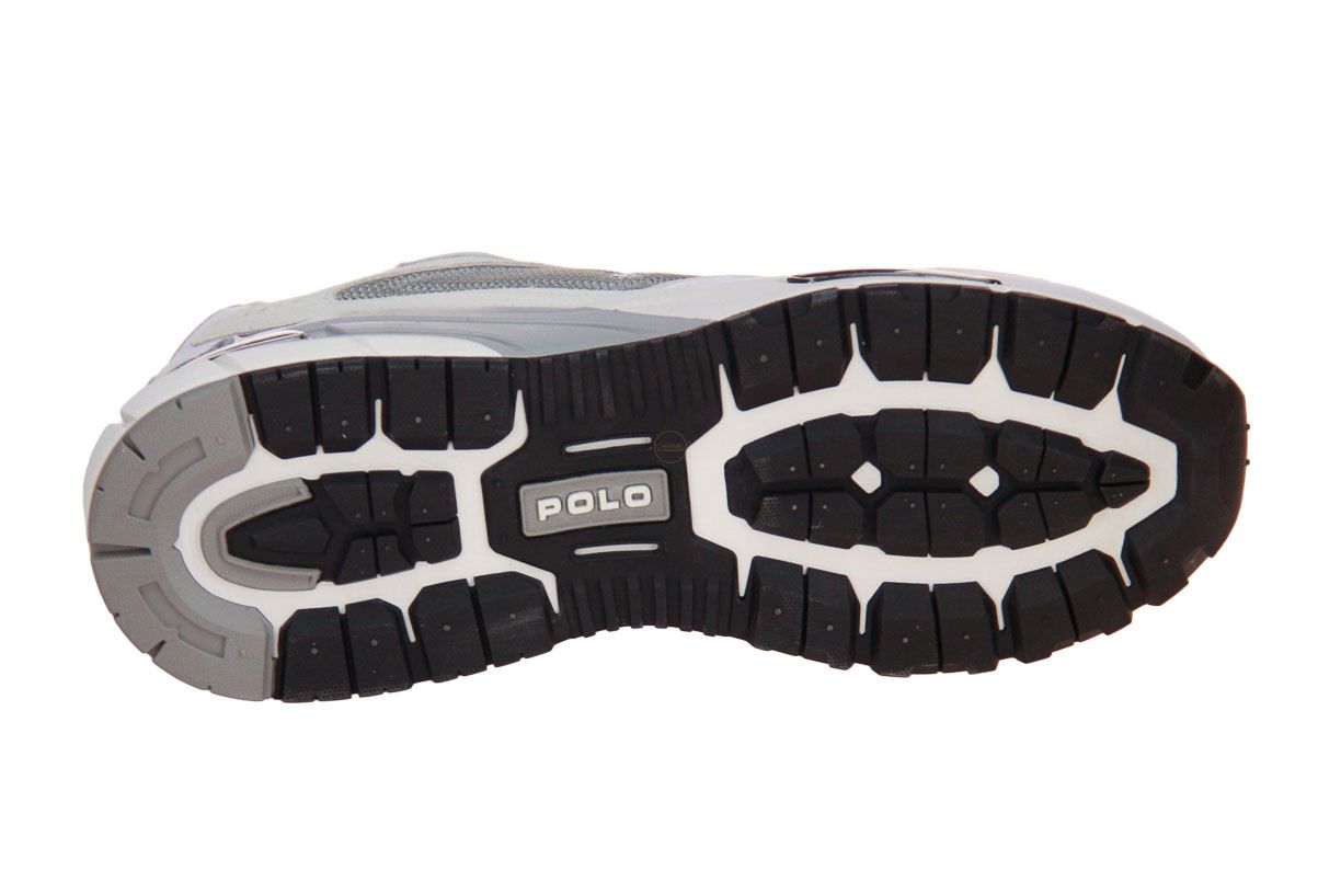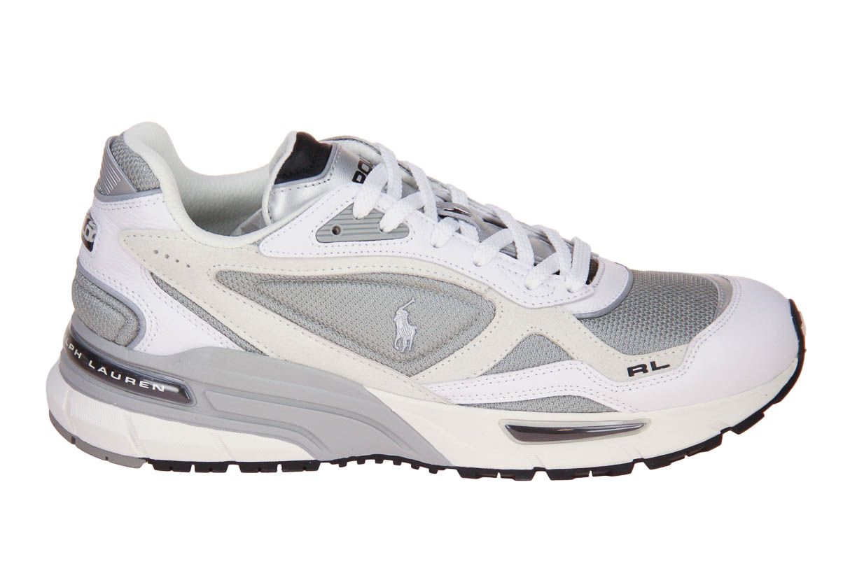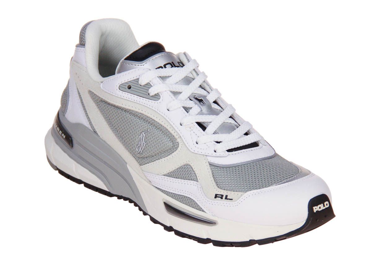 Deze wit lederen herenschoen met grijze accenten is van het merk Ralph Lauren.
