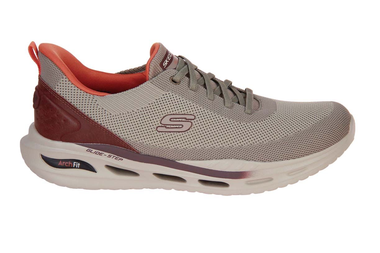 Deze taupe vegan herenschoen is van het merk Skechers.