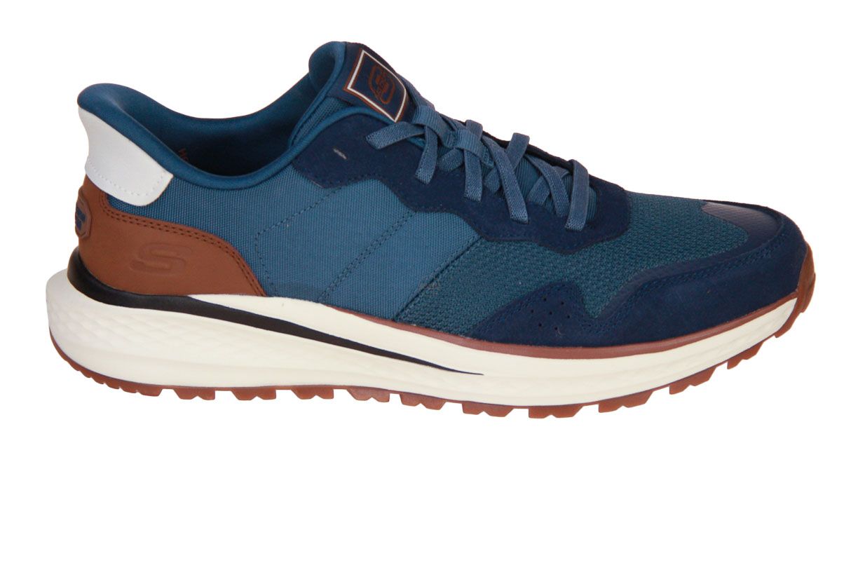 Deze blauw textielen herenschoen is van het merk Skechers.