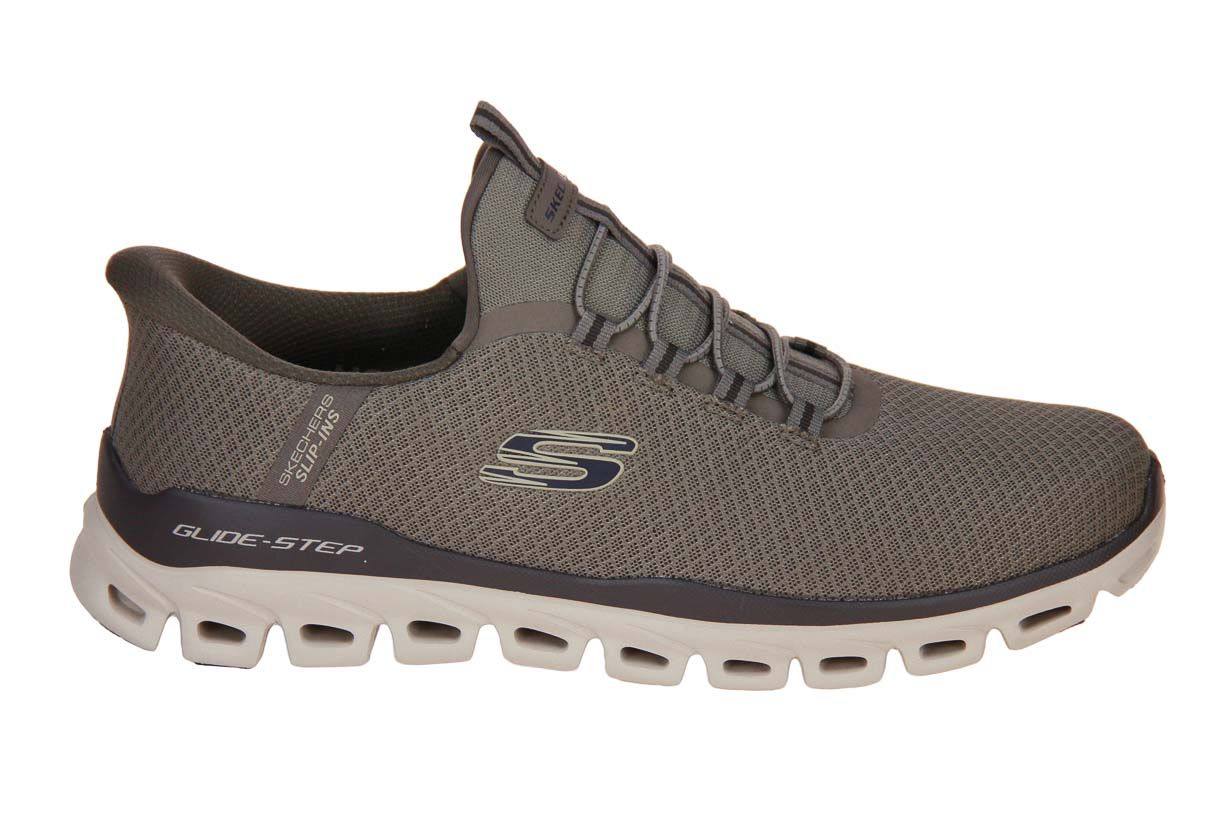 Deze bruin textielen herenschoen is van het merk Skechers.