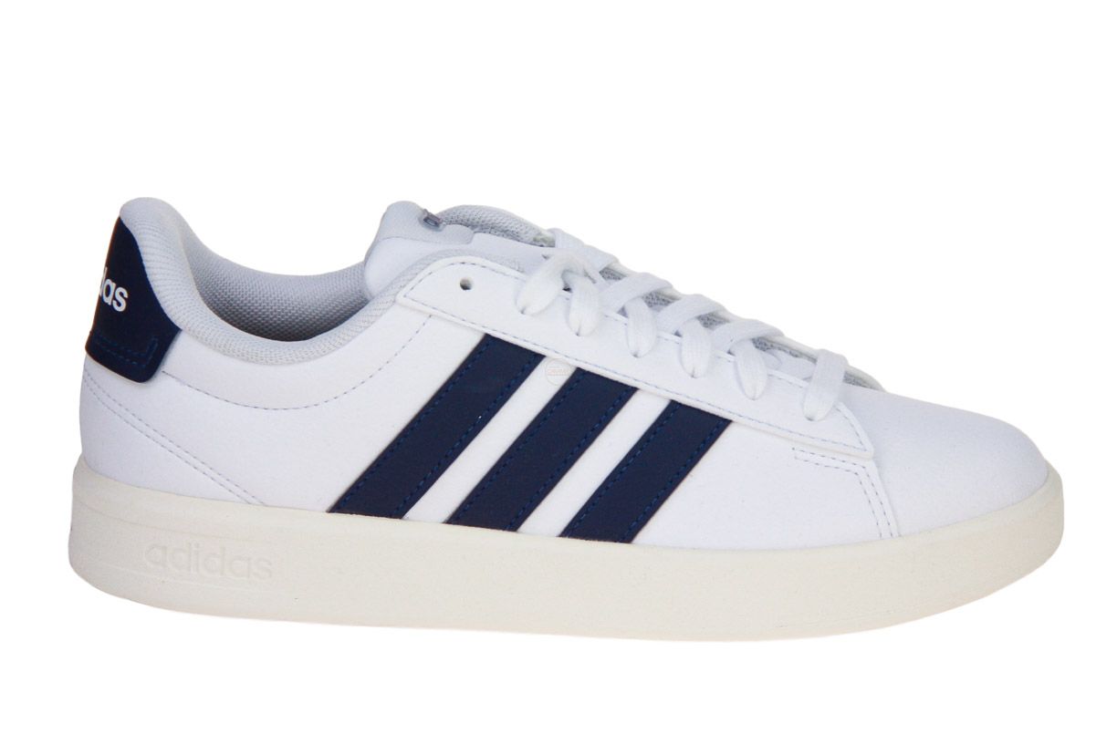 Deze wit synthetisch lederen sneaker is van het merk Adidas.