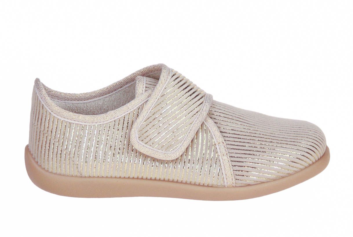 Deze goud textielen meisjespantoffel is van het merk Bellamy.