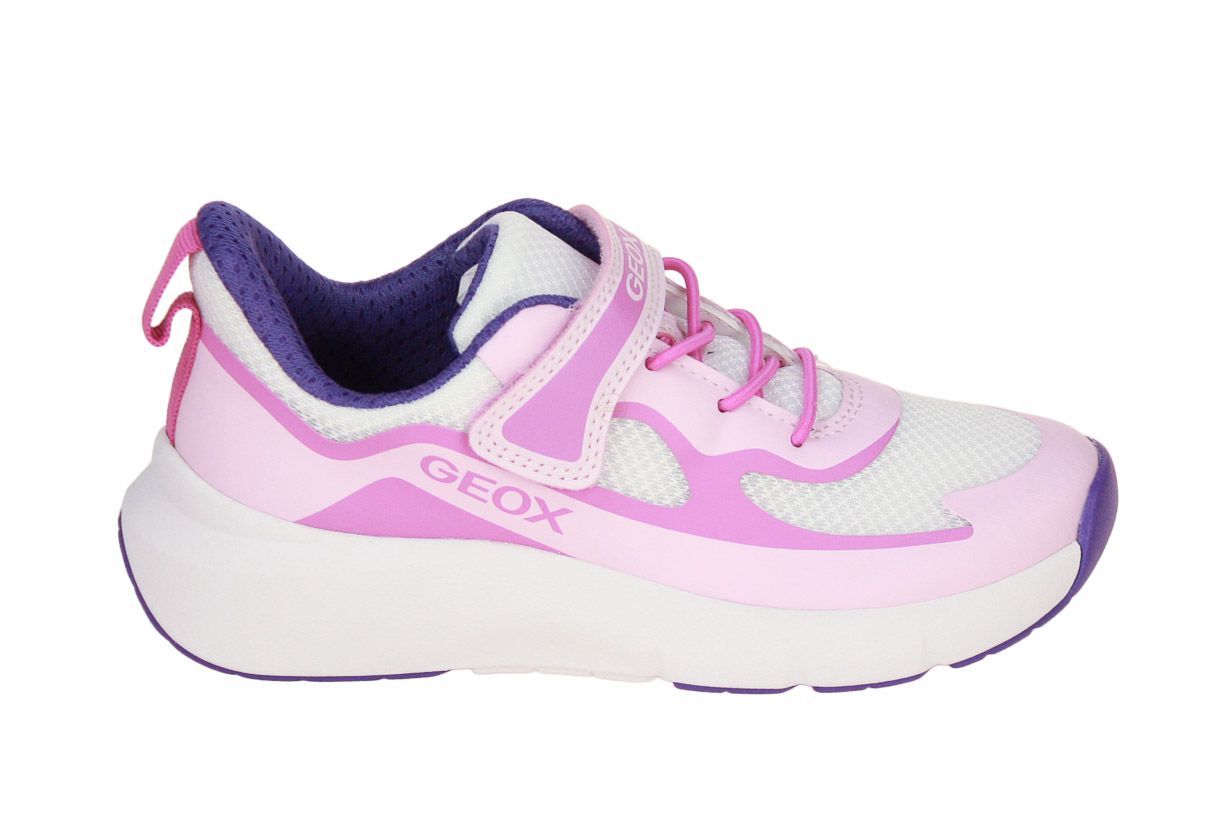 Deze roze textielen meisjesschoen met witte accenten is van het merk Geox.