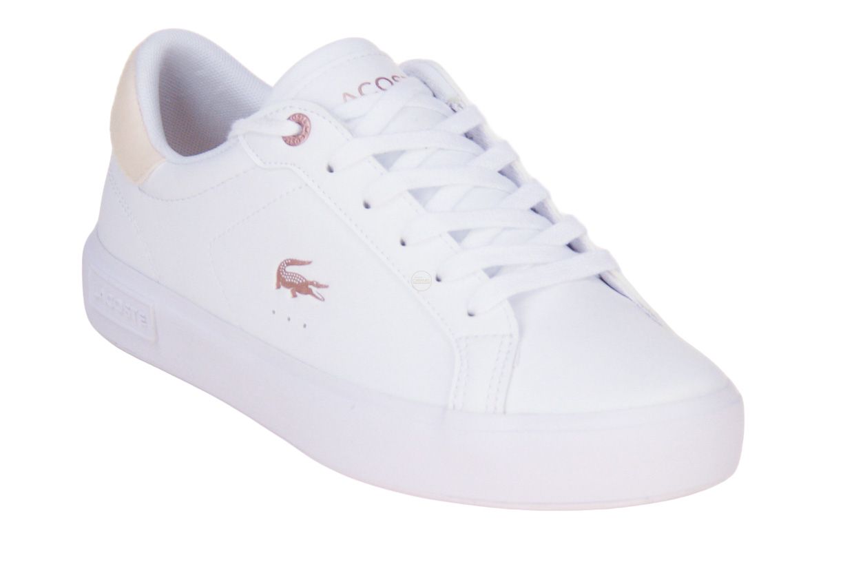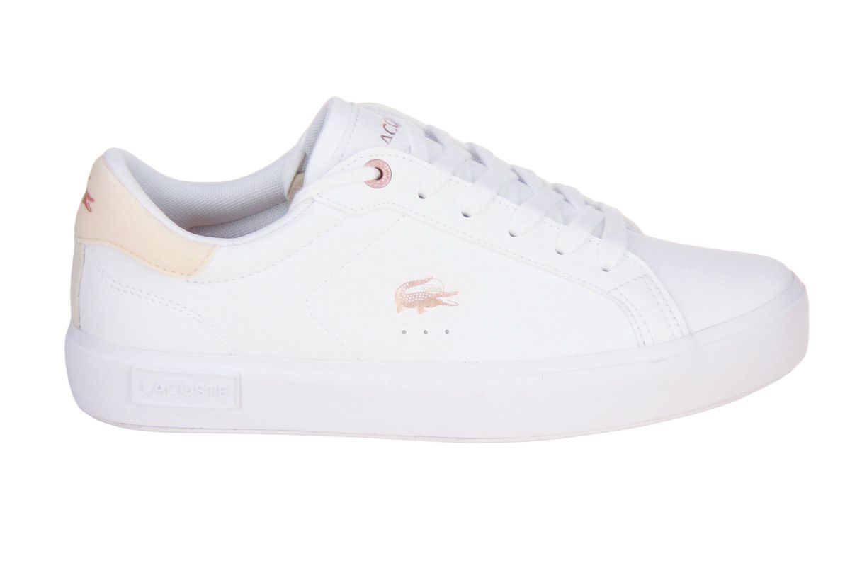 Deze wit synthetisch lederen meisjesschoen is van het merk Lacoste.