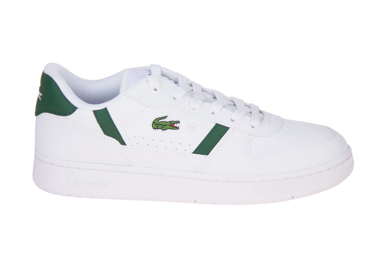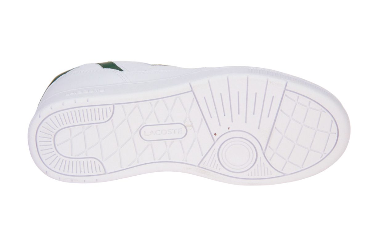 Deze wit synthetisch lederen sneaker met groene accenten is van het merk Lacoste.