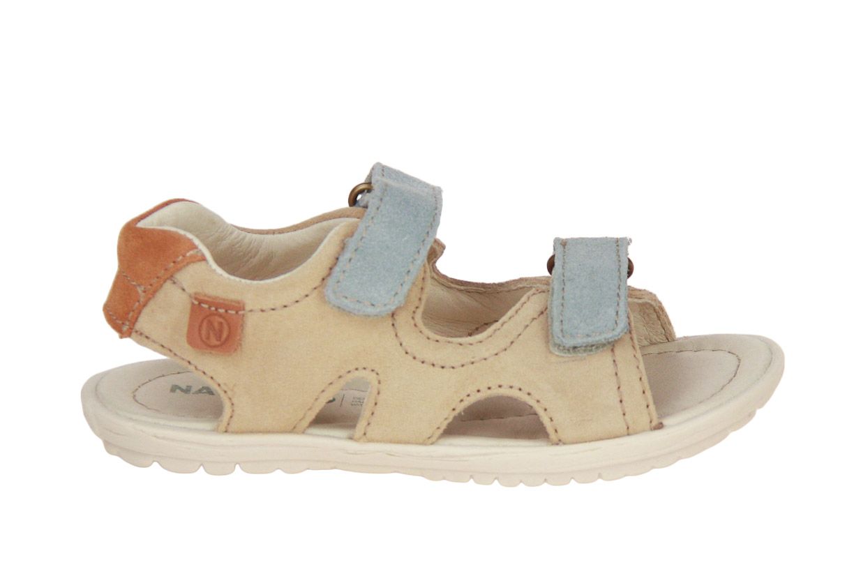 Deze beige suède jongenssandaal met blauwe accenten is van het merk Naturino.