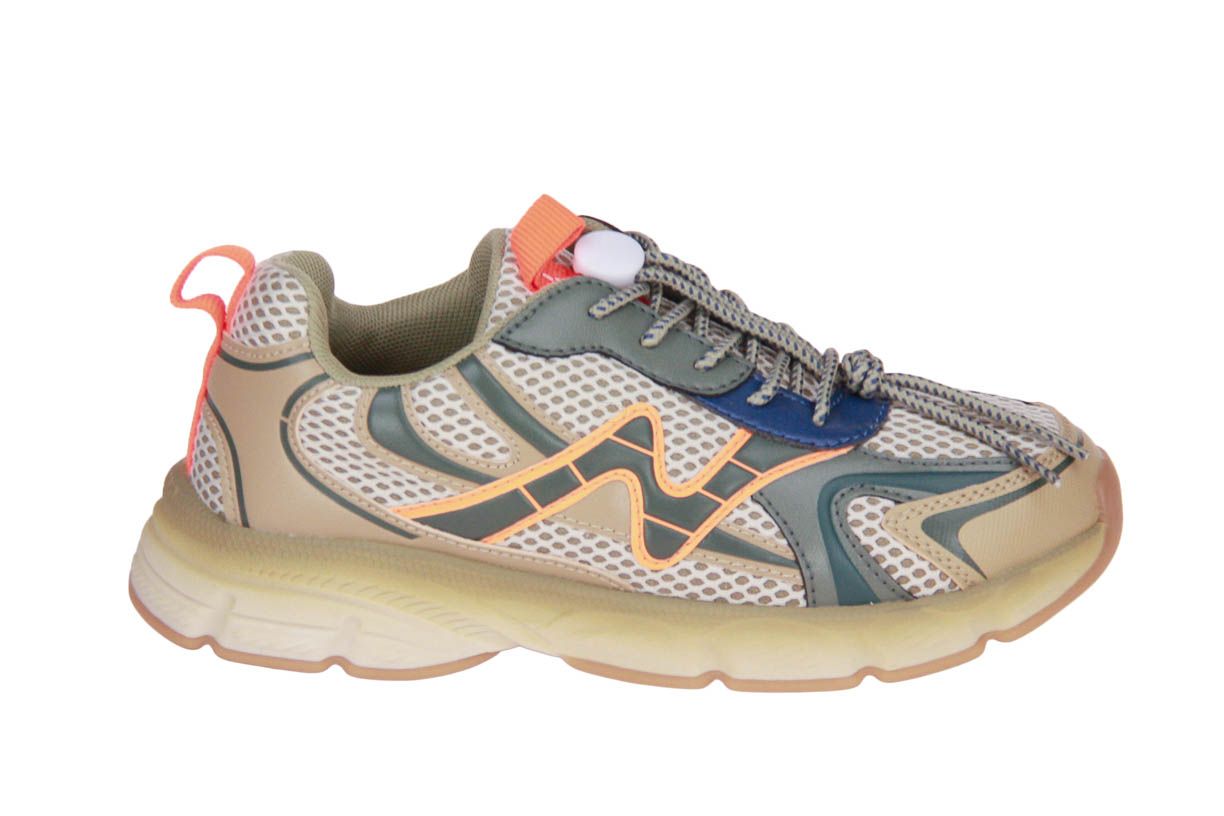 Deze stoere groen/bruine sneaker met fluo oranje accenten is van het merk Naturino.
