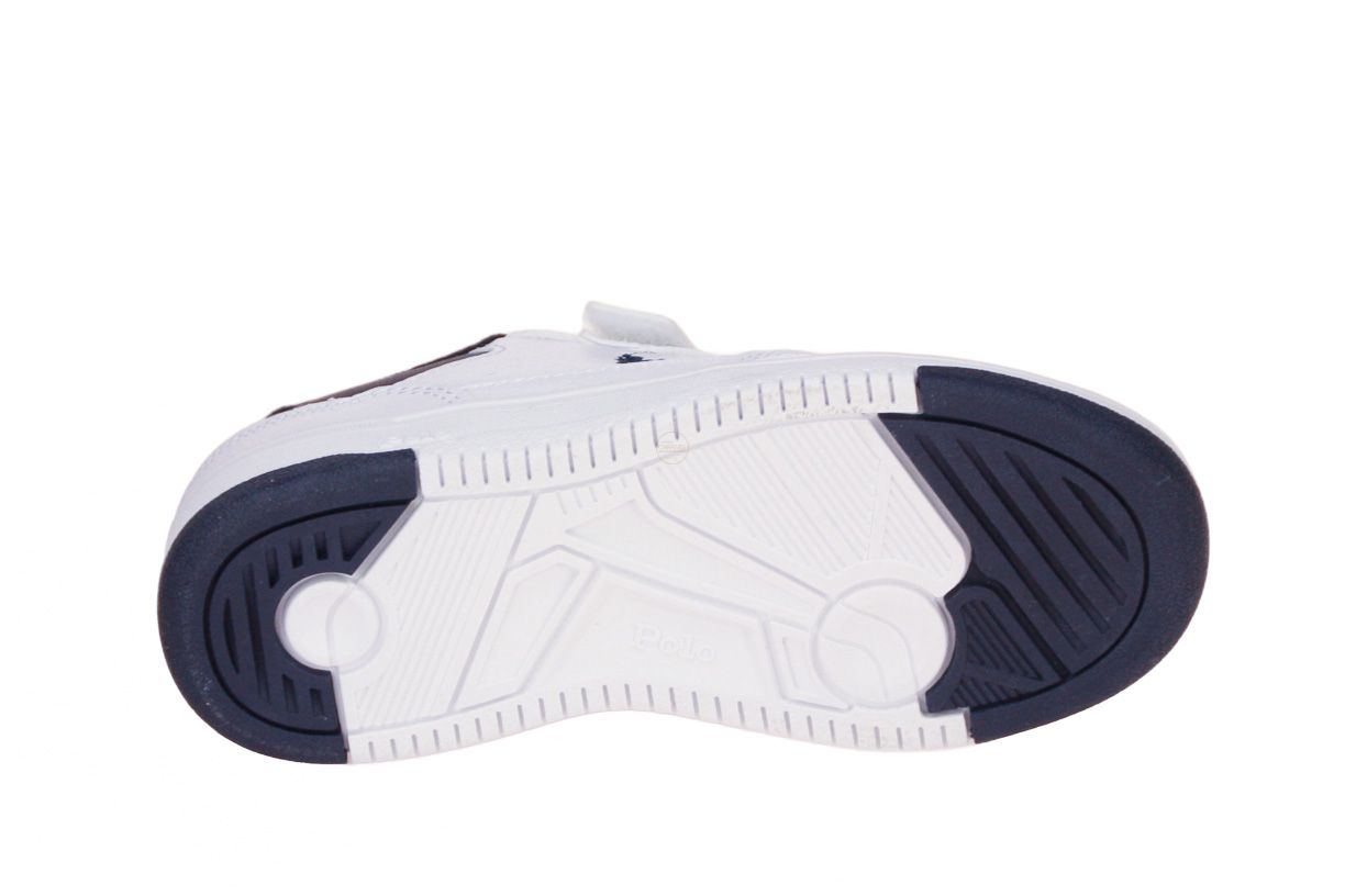 Deze wit lederen kinderschoen met blauwe accenten is van het merk Ralph Lauren Polo.