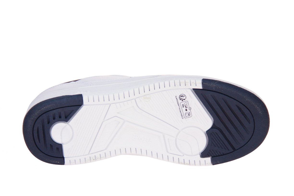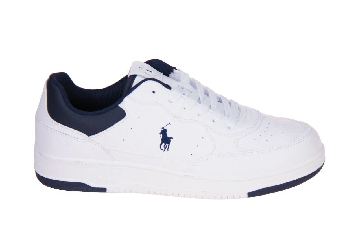 Deze wit lederen sneaker met blauwe accenten is van het merk Ralph Lauren.
