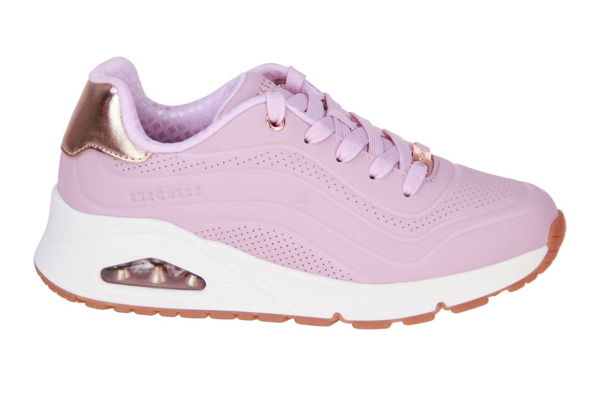 Deze roze synthetisch lederen sneaker is van het merk Skechers.