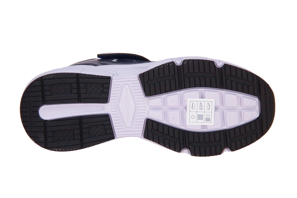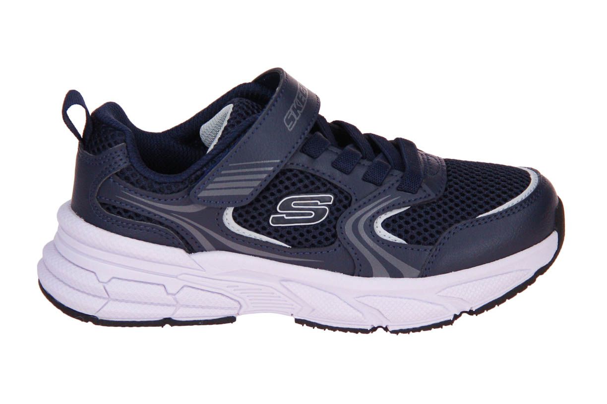 Deze blauw synthetisch lederen jongensschoen is van het merk Skechers. De schoen is wasmachine bestendig.