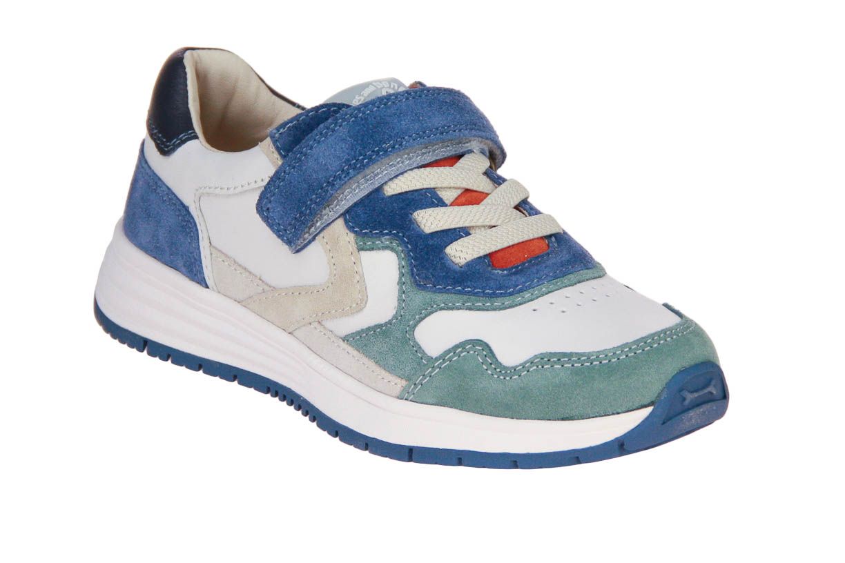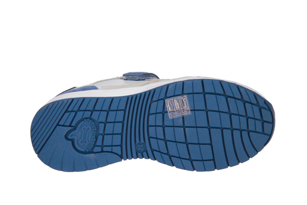 Deze offwhite lederen jongensschoen met blauw en groene accenten is van het merk Stones and Bones. De binnenzool is uitneembaar, ideaal voor steunzolen.